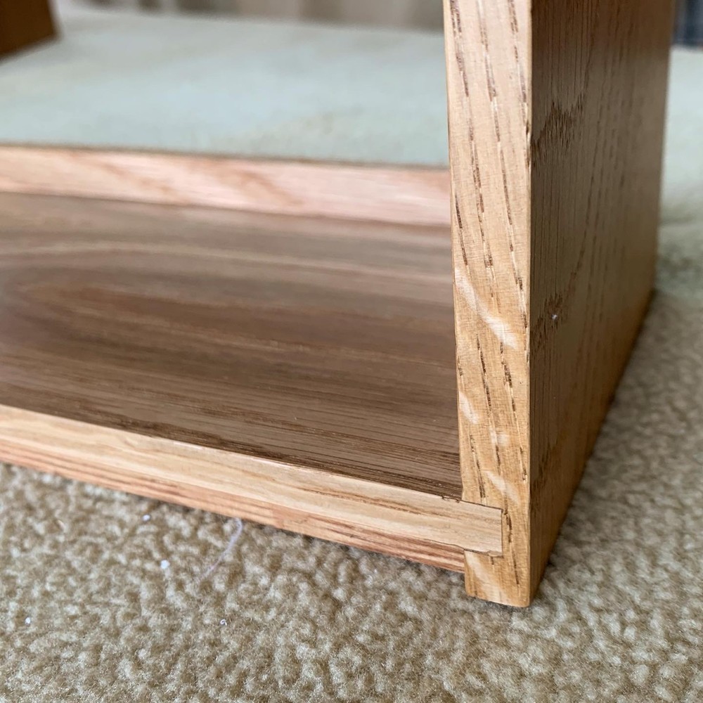 무늬목과 시트지로 마감되어 요즘 유통되는 대부분의 가구와 달리 덩어리 나무를 가져와 고유의 특징들을 살리며 작업한 결과 강인한 참나무의 표면을 나타낼 수 있었습니다.