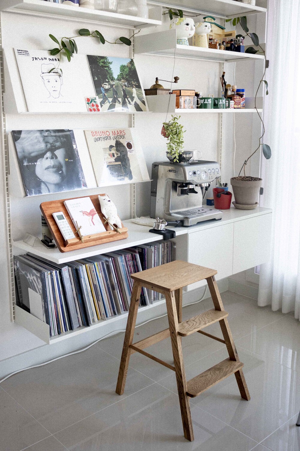 매일 높은 책장의 무거운 책들을 정리하고 가끔은 다리를 올려 쉬기도 합니다.