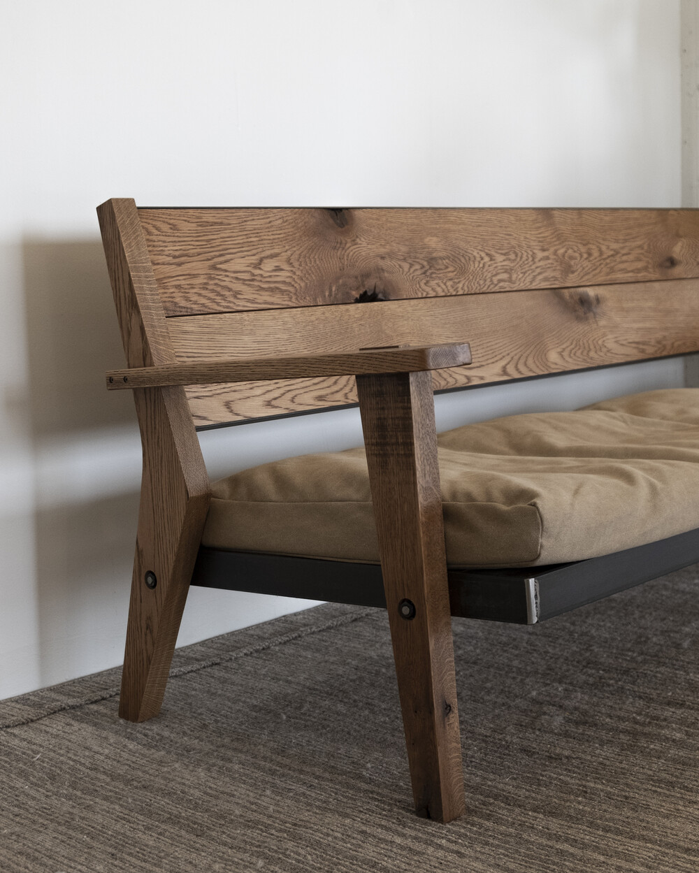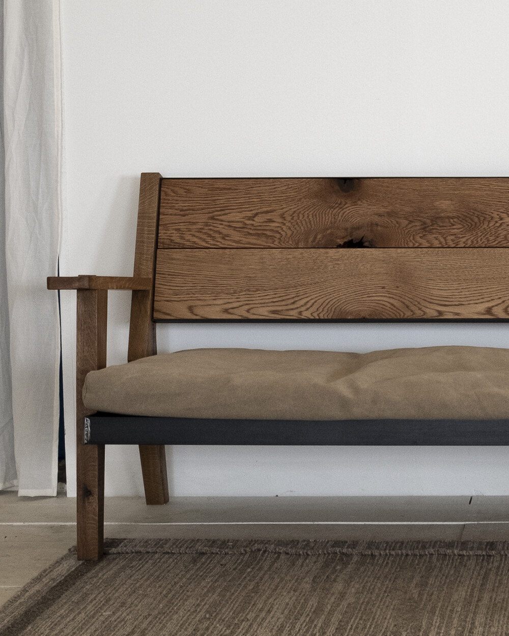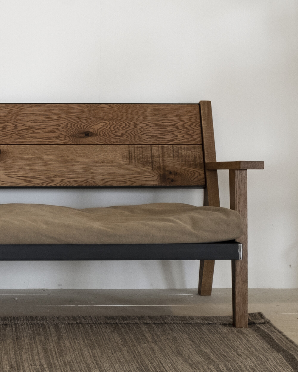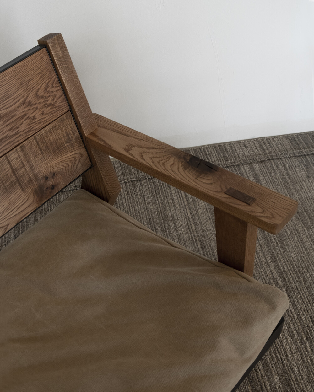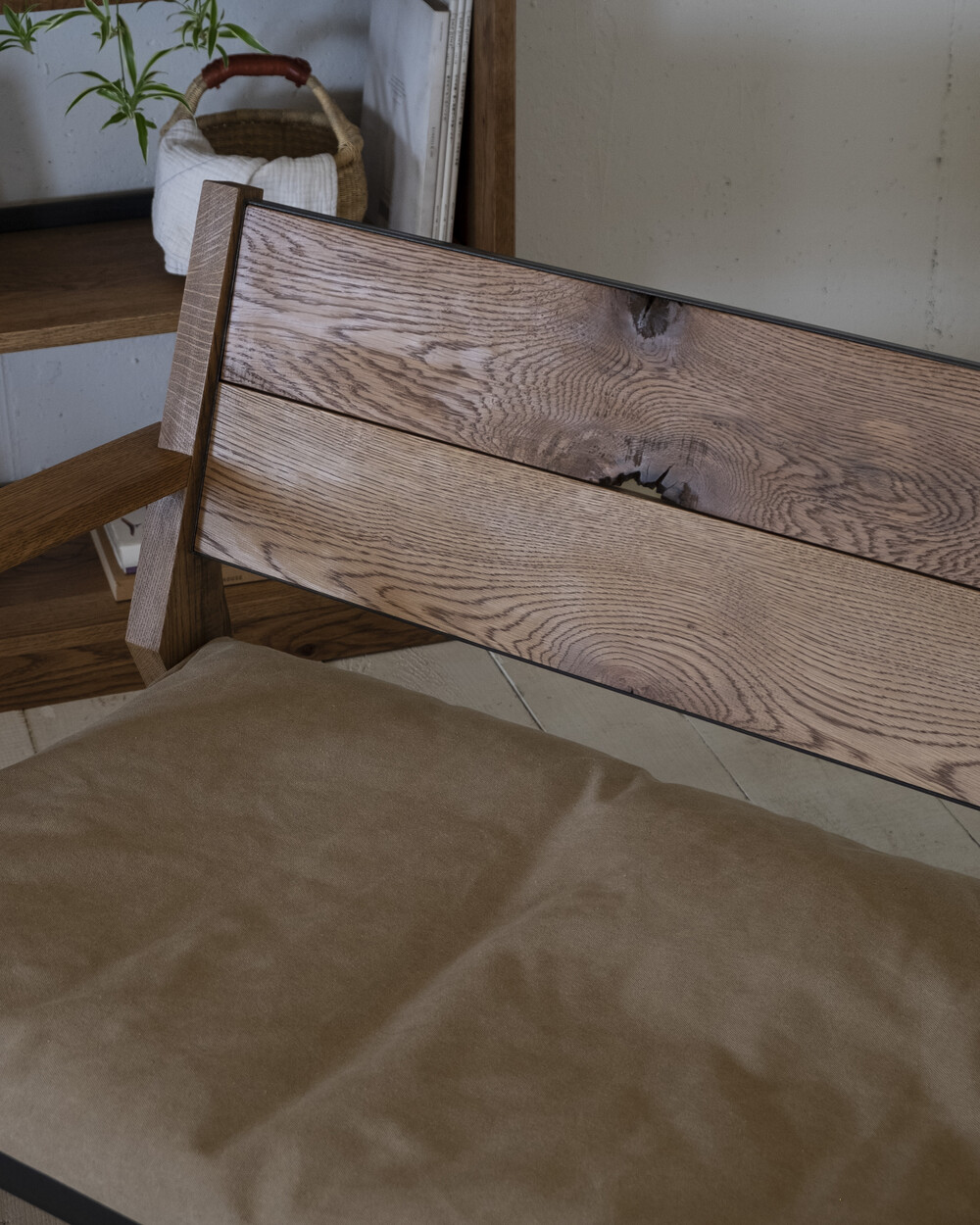 무늬목과 시트지로 마감되어 요즘 유통되는 대부분의 가구와 달리 덩어리 나무를 가져와 고유의 특징들을 살리며 작업한 결과 강인한 참나무의 표면을 나타낼 수 있었습니다.
