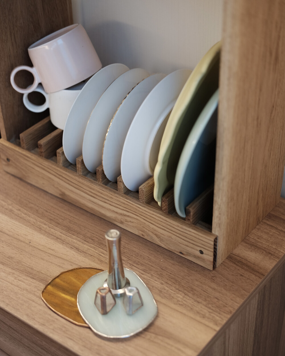 접시 뿐만 아니라 파스타 볼처럼 오목한 그릇 또한 충분히 보관할 수 있으며, 상단의 선반에는 컵, 양념통 등 다양한 소품들을 넣고 활용할 수 있습니다.