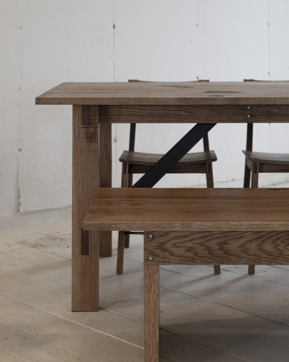 무늬목과 시트지로 마감되어 요즘 유통되는 대부분의 가구와 달리 덩어리 나무를 가져와 고유의 특징들을 살리며 작업한 결과 강인한 참나무의 표면을 나타낼 수 있었습니다.